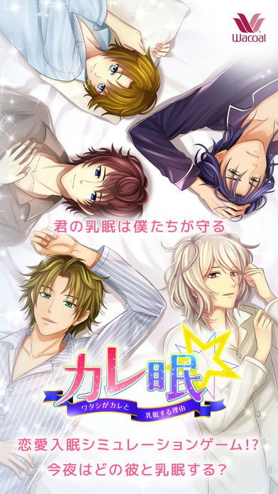 カレ眠★~ワタシがカレと乳眠する理由~ アプリ 2017年09月04日 EDIT 出演花江夏樹/岡本信彦/島崎信長/江口拓也/諏訪部順一内容紹介“カレ眠”は、女性のここちよい眠りをサポートする為につくった恋愛入眠シミュレーションゲームです。ワコールが今年8月に発表した調査では、日本女性の5人に1人が、就寝時に自分のバストが「邪魔」(22.0%)と感じたことがあり、就寝時にバストが動いたり左右に広がるなど、眠っていても「バストは睡眠(休息)できていない」(20.5%)と実感していること、また、パートナーに愛され睡眠の質も高い女性は“パジャマ”着用などの「入眠儀式」を実践していることが分かりました。そこで、睡眠前の「入眠儀式」と、睡眠中の「乳眠」を楽しみながら行っていただき、女性の眠りの質を高めるサポートを行うべく、『カレ眠-ワタシがカレと乳眠する理由-』をつくりました。シナリオ、キャラクター、音楽はすべてオリジナルです。ゲームストーリーは、よりよい眠りについての知識をイケメンが教えてくれ、入眠に関する学びにもなる毎日の眠りが楽しみになる恋愛シミュレーションゲームです。 http://goodslog.blog.shinobi.jp/Entry/6155/カレ眠★~ワタシがカレと乳眠する理由~