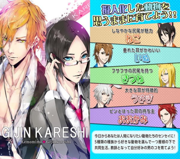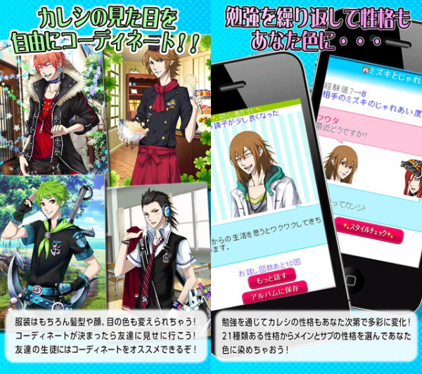 けもみみ☆擬人カレシ[アプリ] グッズログ 2014年02月05日 EDIT ↓iPhone↓↓Android↓****ゲームの特徴**** 【いつもあなたと一緒・・・】 カレシにとって、あなたは全てなのです! お勉強や、お仕事、睡眠までリアルタイムで進行します。カレは常にあなたと同じ時間を共有しています。 【性格もあなた色に・・・】 教師であるあなたの教えに従って、カレの性格も変化していきます。性格が変化すると、カレのしゃべり方にも変化が!21種類の性格から自分好みの性格に育てていきましょう。さらにサブ性格を設定することで、他にはどこにもいないッ!あなた色のカレに染めちゃいましょう! 【カレシの見た目を自分好みにコーディネート!】 服装だけでなく、髪型・目型・色・装飾品!アバターの組み合わせは無限大!あなたの好きな見た目は、クール系?V系?それとも、やんちゃ系?自分好みのカッコイイカレシにしてあげましょう! 【他のユーザーと協力しながら、自分のカレ自慢も!】 他ユーザーの生徒たちと「アドバイスし合う」ことで効率よくカレシを育成することができます。また「オススメ」機能では、友達に自分の好きなアバターを試着させ自慢することができちゃいます。逆に気になるアバターは「スタイルチェック」で詳細を確認することが可能です。自分のカッコイイカレシを、おもいっきり自慢しちゃおう! 【主人公である、あなたの性別も選べる!?】 主人公のあなたは女性?男性?好きな性別を選べるのも、このアプリの特徴です。 カレは女性のあなたに恋をするのか、それとも・・・。 http://goodslog.blog.shinobi.jp/Entry/1418/けもみみ☆擬人カレシ[アプリ]