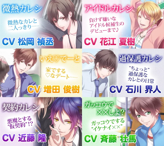 シチュエーションカレシ[アプリ] グッズログ 2014年03月15日 EDIT 人気声優がダミーヘッドマイクを使用して、特別なシチュエーションで喋りかける「シチュエーションカレシ」登場第1弾「微熱」キャスト:松岡禎丞第2弾「家でマッタリデート」 キャスト:増田俊樹第3弾「召喚」キャスト:近藤隆第4弾「アイドル」キャスト:花江夏樹第5弾「過保護」キャスト:石川界人第6弾「ガッコウで××しよ?」キャスト:斉藤壮馬 http://goodslog.blog.shinobi.jp/Entry/1512/シチュエーションカレシ[アプリ]