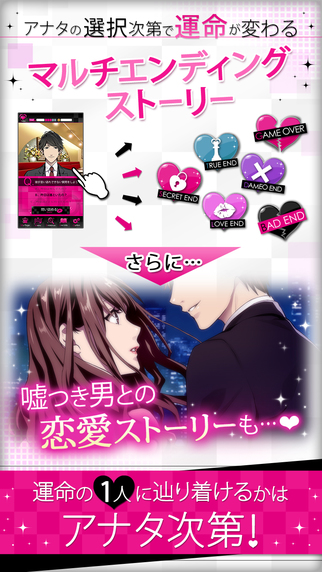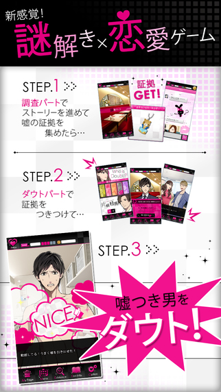 ダウト~嘘つきオトコは誰?~ グッズログ 2015年09月03日 EDIT ■あらすじ誰を疑い、誰を信じる?Who is Doubt?------------------「もしかして、浮気してたの!?」彼氏の浮気発覚、別れから物語は始まったーそして出会った10人のオトコたちでも、その中の9人は嘘をついていた!私は騙されない。手に入れてみせる、最高のオトコをー!■ドラマティックでスリリングな謎解き恋愛ストーリー『ダウト~嘘つきオトコは誰?~』は、無料で遊べるノベル形式の謎解き恋愛アプリです。毎日5枚無料で付与されるチケットを使い、画面タップで読み進めるカンタン操作。--------------STEP.1 調査パートストーリーを進めて、嘘の証拠を集めるSTEP.2 ダウトパート集めた証拠を彼につきつけて…嘘つきオトコをダウト!!--------------ダウトパートの選択肢によって、多数の結末が用意されています。全ての嘘つきオトコをダウトし、運命の1人に辿り着くことが出来るかはアナタ次第! ■キャラクター紹介個性的な10人の“嘘つき”?オトコたち◇無骨クール 志賀颯太郎「俺は恋人にするのも嫁にするのも…君がいい」◇ドライな自信家 室井國雄「俺と付き合うって言うまで、離さない」◇ミステリアス策士 片桐桂馬「大学時代から好きだったって言ったらどうする?」◇ドSインテリ 間宮春一「往生際が悪いですね…もう待てませんよ」◇ピュアな情熱家 松木蹴人「TVの中の俺じゃなくて、目の前の俺を見て」◇年下腹黒 玄野梓「全部君のせいなんだから、責任とってよ」◇ツンデレ一途 唯川至「俺は君だけを、ずっと愛してる」◇天才肌ナルシスト 矢澤丈「ひと目見てわかったよ。君は俺のミューズだって」◇大人包容力 加賀美和巳「甘い恋愛ごっこにキョーミないんだよね」◇ヘタレ好青年 樫 冬也「僕の気持ち…受け取ってくれる?」 http://goodslog.blog.shinobi.jp/Entry/3210/ダウト~嘘つきオトコは誰?~